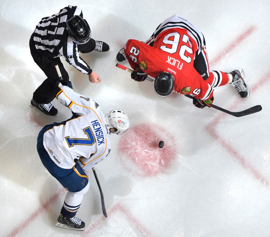 • For all face-offs (excluding center ice), the defending player shall place his stick on the ice first; for face-offs at center ice, the visiting player shall place his stick on the ice first.
