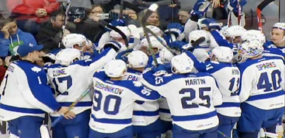 The Toronto Marlies trailed 8-4, yes eight to four, 47 seconds into the third period, in what had already been a barn burner. Fucale in net for St. John’s had been as terrible as he was brilliant the previous evening while Bibeau looked a little stale after a spell up with the Leafs and was replaced by Sparks after the eighth goal.