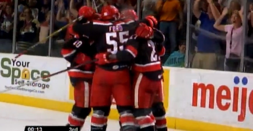 Though throwing six skaters onto the ice from the resumption of play, Syracuse were unable to fire a shot in anger as Grand Rapids took victory in game one.