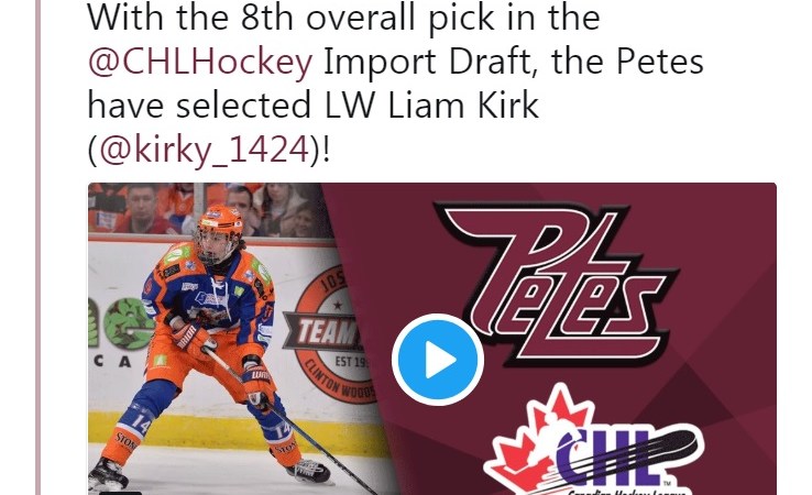 With the 8th overall pick in the 2018 CHL Import Draft today (Thursday June 28, 2018), the Peterborough Petes selected left winger Liam Kirk.