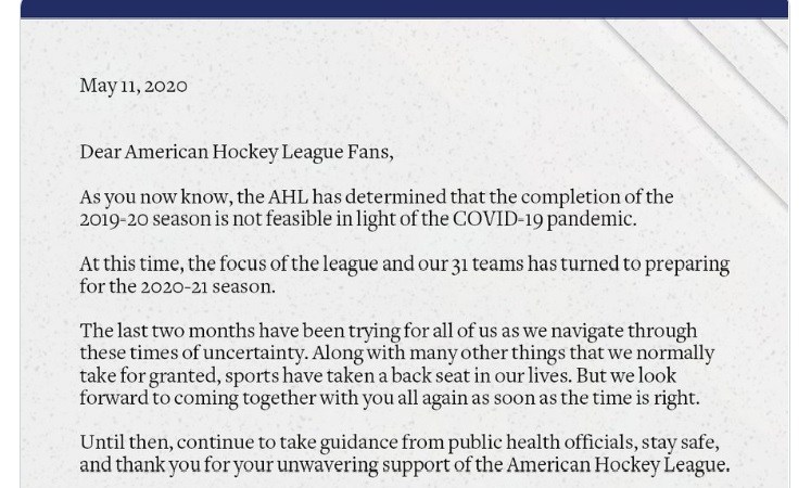 After holding a board of governors meeting on Friday, the American Hockey League put out a statement on Monday, May 11, 2020, confirming the inevitable demise of the 2019-20 season.