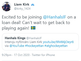 If all relevant paperwork is completed and ratified then Kirk could make his professional debut outside of the UK as soon as tomorrow, Sunday 18th October 2020 against Vimmerby HC.