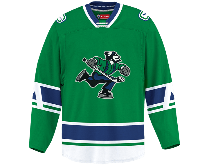 The Canucks colours are described as “Field green, Pacific blue, Fraser Blue, valley fog grey and mountain white, representing the area that the Abbotsford Canucks will proudly play for.”