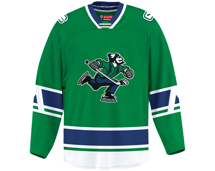 The Canucks colours are described as “Field green, Pacific blue, Fraser Blue, valley fog grey and mountain white, representing the area that the Abbotsford Canucks will proudly play for.”