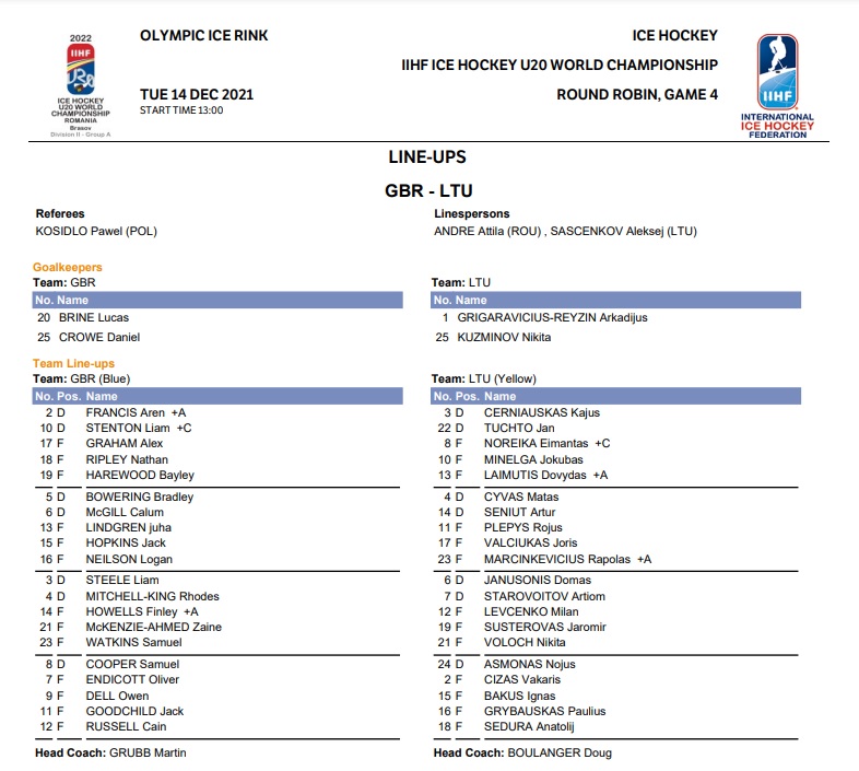 It appeared as if Lithuania would hold a vital 1-0 lead through twenty minutes but Rhodes Mitchell-King had other ideas. The defenseman carried the puck on a rush starting from his GB side of the red line. Cain Russell got a shot away and standing on the doorstep to put home the rebound was Bayley Harewood.