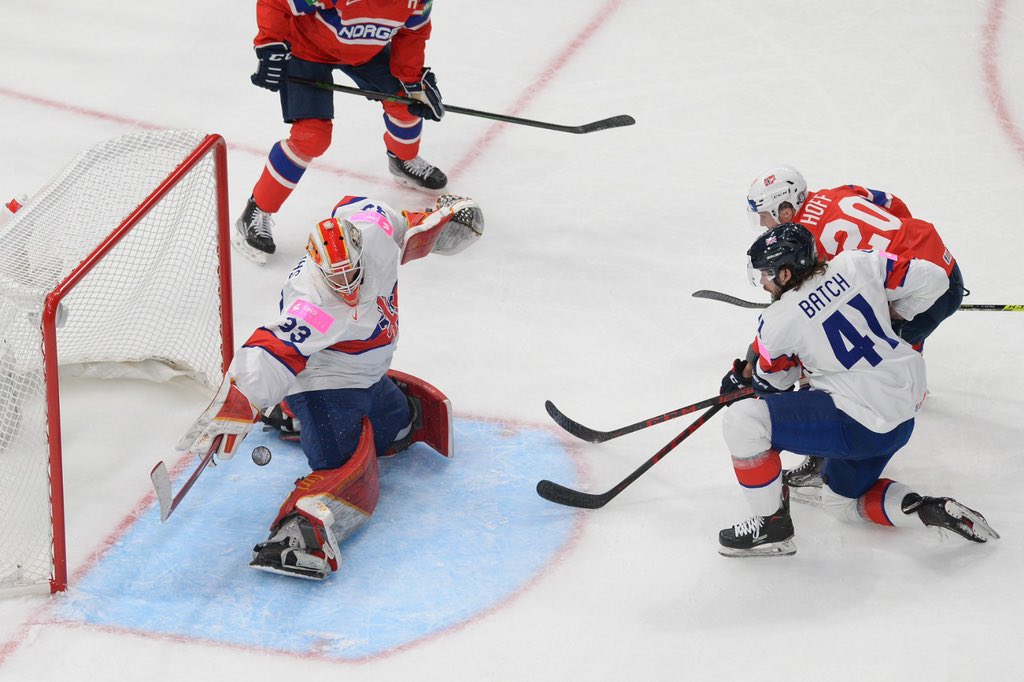 Andreas Klavestad threw the puck toward the net from the half-boards. There appeared to be little danger as Davey Phillips intercepted the pass come shot. Except the defenseman deflected the puck between Bowns’ five-hole to give Norway a 1-0 lead.