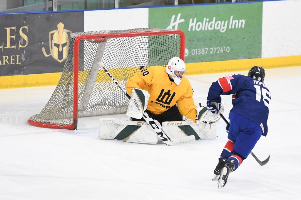 The home nation rarely threatened the Lithuanian net but did create three chances of note. One at the four-minute mark from the slot and the second, as the midway point of the period approached. Jack Hopkins jumped on an error down the right wing and duly drove hard to the net. He was slashed as his backhand shot went wide, drawing the first penalty of the game.