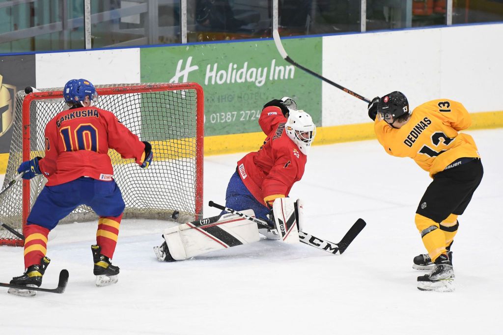 A blocked shot created an odd-man rush and the impressive Linas Dedinas scored with ease, far side on Mampel, to give Lithuania a 2-0 lead through twenty minutes.
